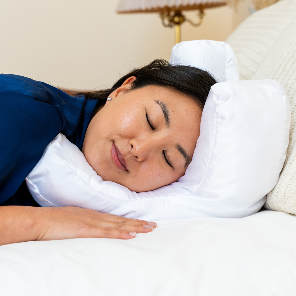 Position #2: If you're a side sleeper, ensure the pillow is placed on its back. This keeps the face exposed through the cutout, minimizing the risk of wrinkles while maintaining comfort. You can also adjust your head position to expose your ear for added comfort.